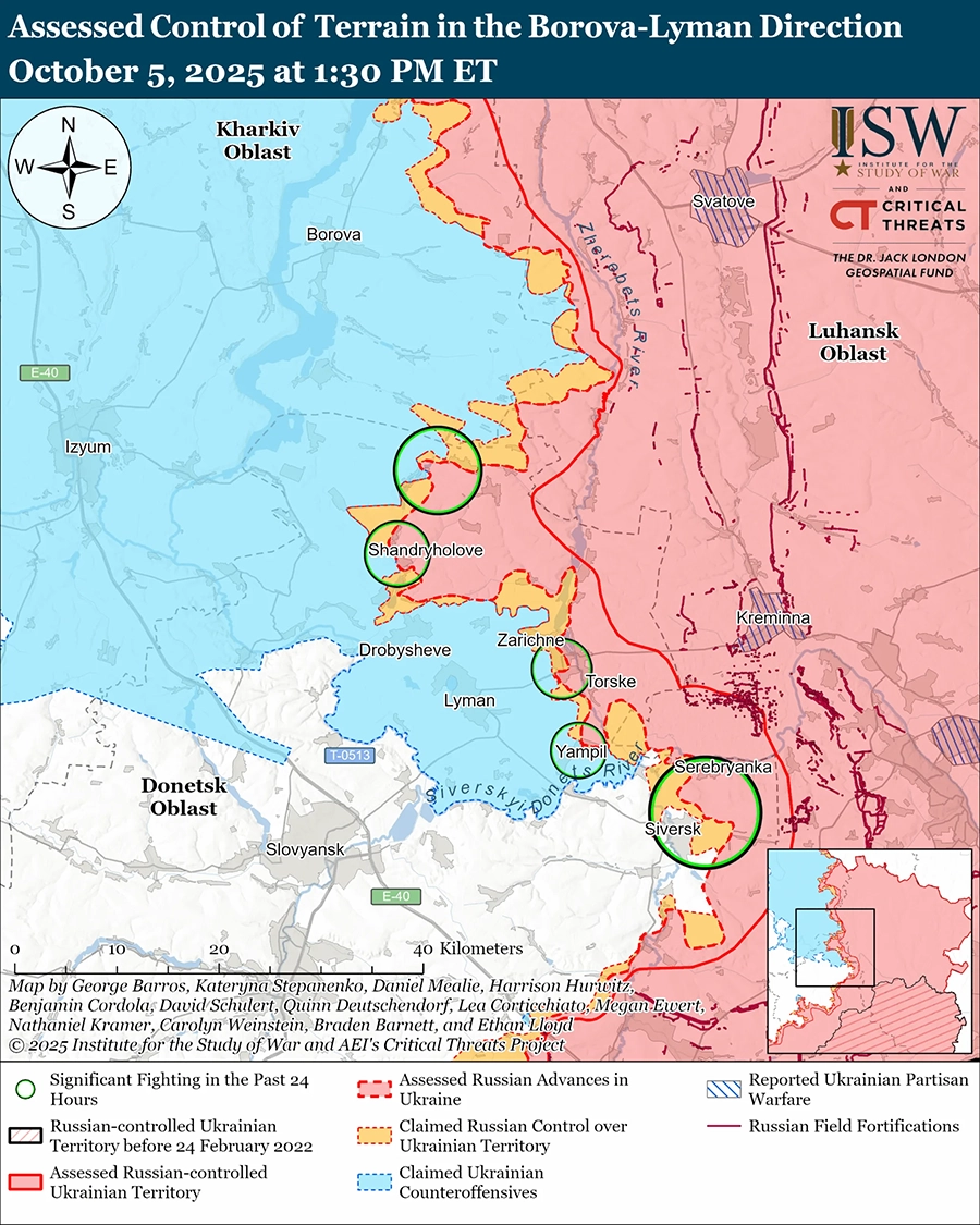 Российские военные блогеры заявили 5 октября, что российские войска нанесли удар планирующей бомбой ФАБ-3000 по мосту через реку Северский Донец в Райгородке (к юго-западу от Лимана), а на геолоцированных кадрах, опубликованных 5 октября, виден удар по мосту к северо-востоку от Райгородка. [38] OSINT-аналитик на X (ранее Twitter) сообщил, что российские войска построили импровизированный мост через реку Жеребец в Лиманском направлении, что позволило российским войскам перебросить через реку не менее пяти танков, одну боевую машину пехоты и одну самоходную артиллерийскую установку, в то время как ветреная погода не позволяла украинским разведывательным беспилотникам летать. [39] Геолоцированный снимок импровизированного моста указывает на то, что российские войска смогли перебросить технику к западу от Невского (к северо-востоку от Лимана в ближнем тылу России). [40] Российский военный блогер утверждал, что российские войска установили огневой контроль над трассой C051022 и трассой C051021 Заречное – Дробышево. [41] Российский военный блогер утверждал, что российские войска наносят удары по трассе Т-0514 Лиман-Славянск. Российский военный блогер заявил, что российские войска вытеснили украинские войска из Мирного, восстановив российский маршрут снабжения через реку Жеребец из Ямполовки (к востоку от Мирного через реку).