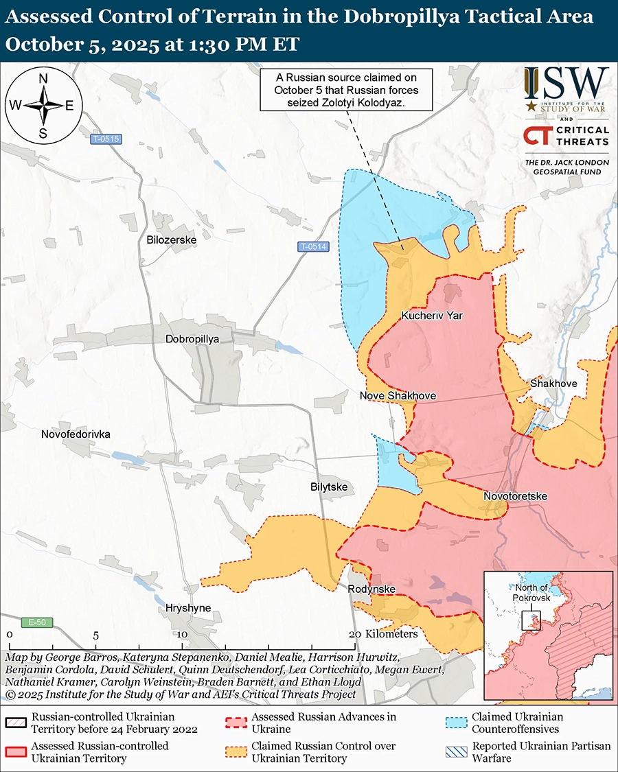 Президент Украины Владимир Зеленский и председатель правления украинского государственного газового оператора «Нафтогаз» Сергей Корецкий 5 октября отметили, что российские удары по украинской энергетической инфраструктуре являются сознательной попыткой лишить мирных жителей Украины отопления в преддверии зимы 2025-2026 годов. [10] Российские удары 4-5 октября по украинской гражданской и энергетической инфраструктуре являются последними в рамках давней кампании России по ухудшению энергетической безопасности Украины в преддверии зимы 2025-2026 годов и деморализации украинского населения. По недавним оценкам ISW, Россия, вероятно, накапливала баллистические и крылатые ракеты в течение сентября 2025 года, чтобы нанести несколько крупномасштабных ударов беспилотниками и ракетами в отдельные спланированные дни. [11]