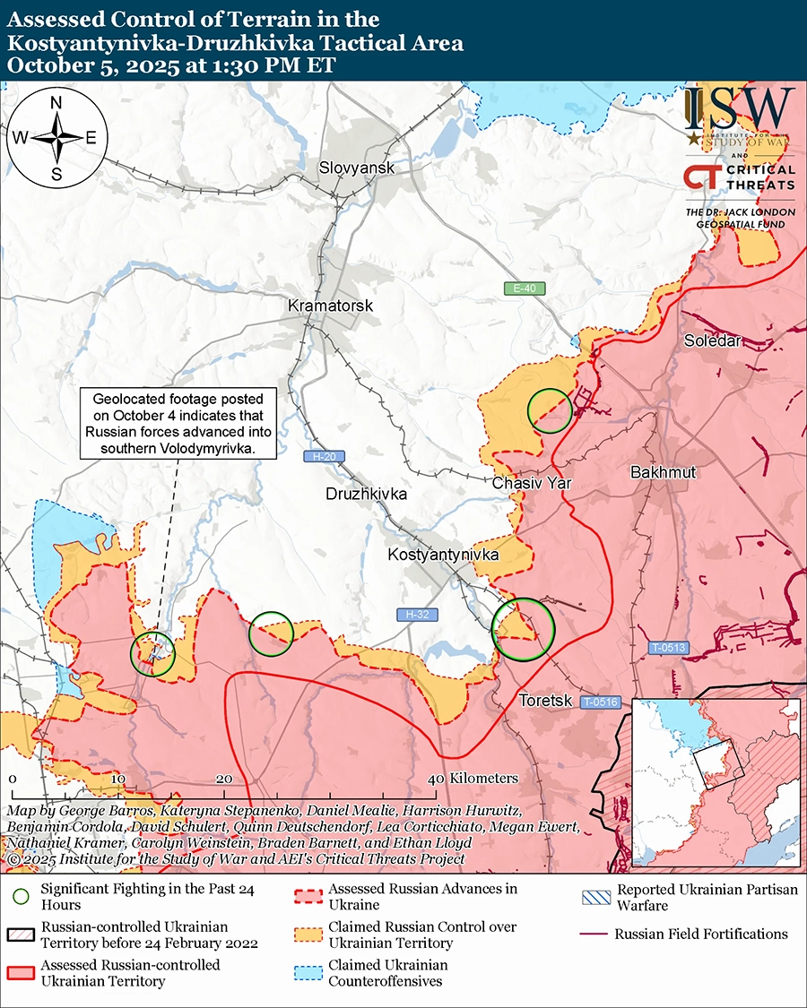 Оценка российского продвижения: геолоцированные кадры, опубликованные 3 октября, указывают на то, что российские войска недавно продвинулись в южной части Владимировки (к юго-западу от Дружковки). [48]