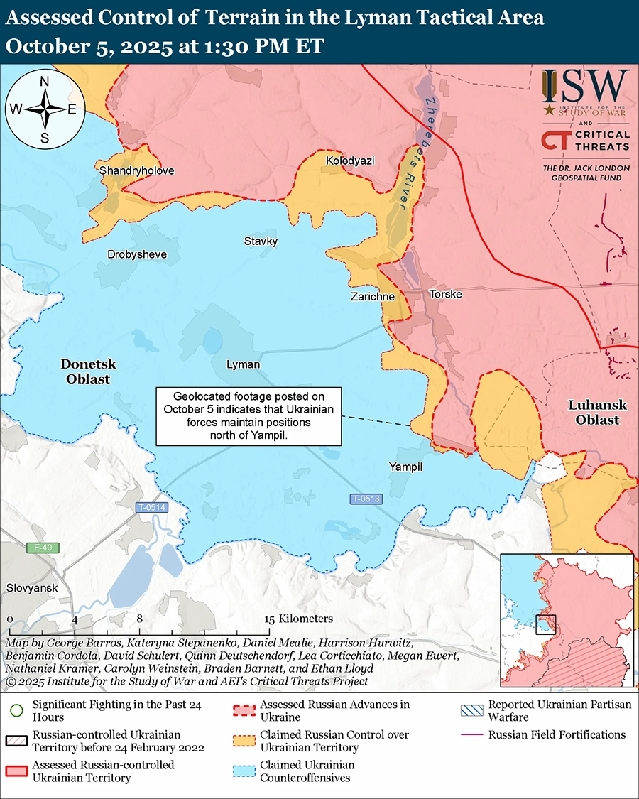 Оценка украинского продвижения: геолоцированные кадры, опубликованные 4 октября, указывают на то, что украинские войска в последнее время незначительно продвинулись вдоль железной дороги к северу от Ямполя (к юго-востоку от Лимана). [34]