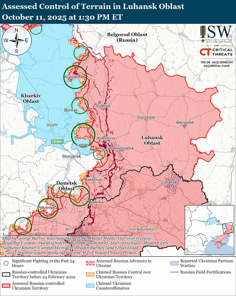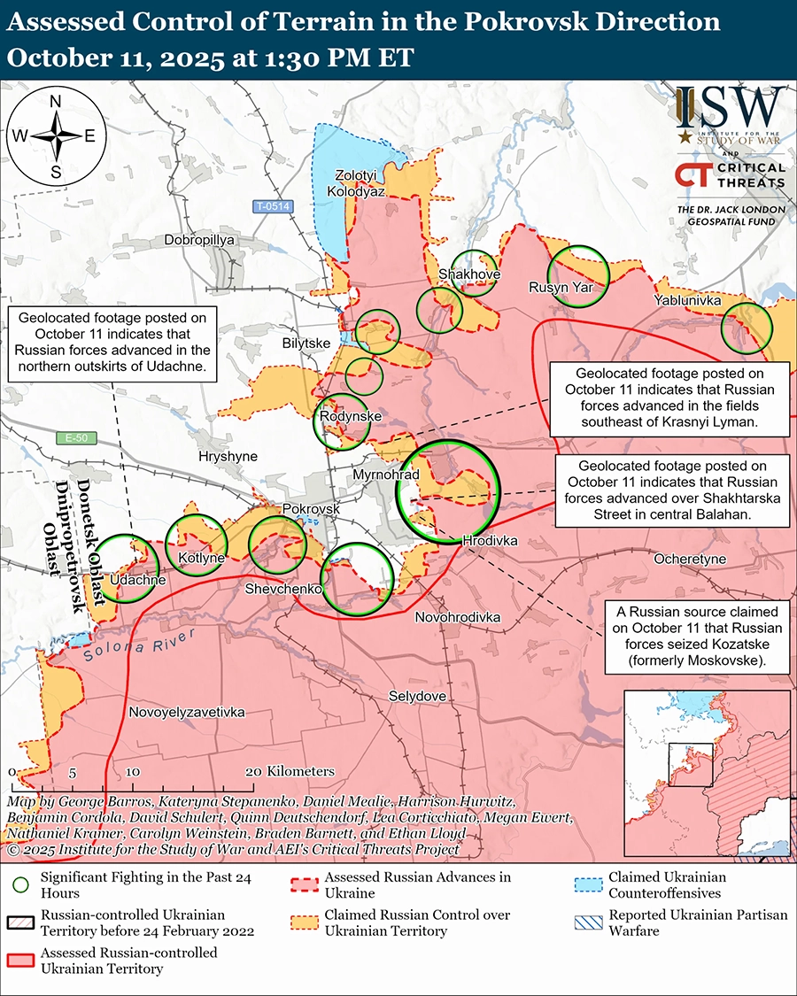 Оценка российского наступления: геолоцированные кадры, опубликованные 11 октября, свидетельствуют о том, что российские войска недавно продвинулись к юго-востоку от Красного Лимана (к северо-востоку от Покровска), в центре Балагана (к востоку от Покровска) и на северных окраинах Удачного (к юго-западу от Покровска). [50]