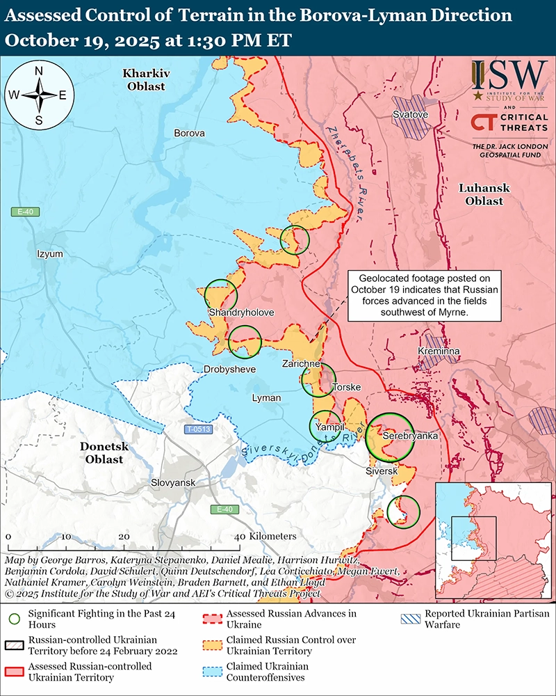 Оценка продвижения российских войск: геолоцированные кадры, опубликованные 19 октября, указывают на то, что российские войска продвинулись к юго-западу от Мирного (к северо-востоку от Лимана). [39]