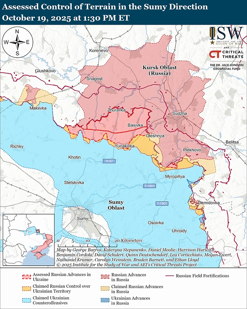 18 и 19 октября бои продолжались в Курской и Сумской областях, в том числе к северу от Сум в районе Андреевки, Алексеевки и Кондратовки. [23]