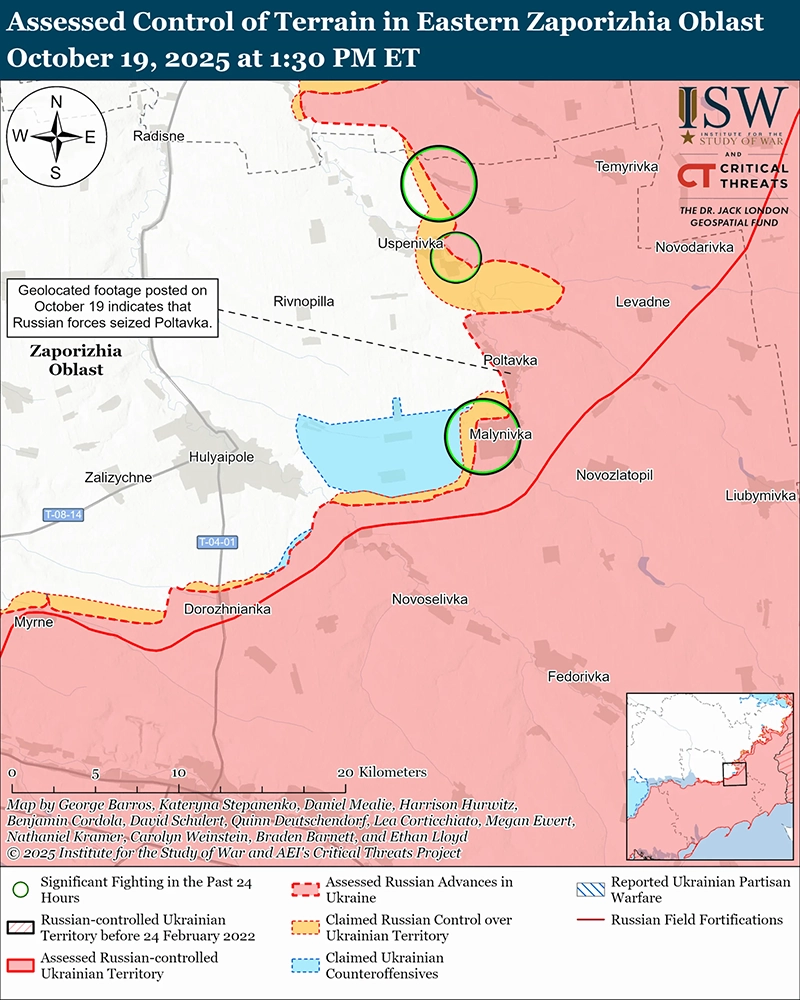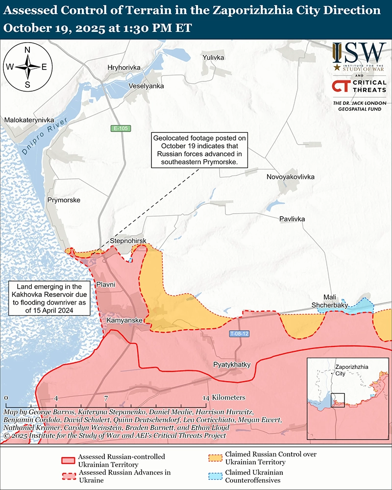 Оценка российского продвижения: геолоцированные кадры, опубликованные 19 октября, указывают на то, что российские войска недавно продвинулись в юго-восточном Приморском (к северо-западу от Орехова). [79]