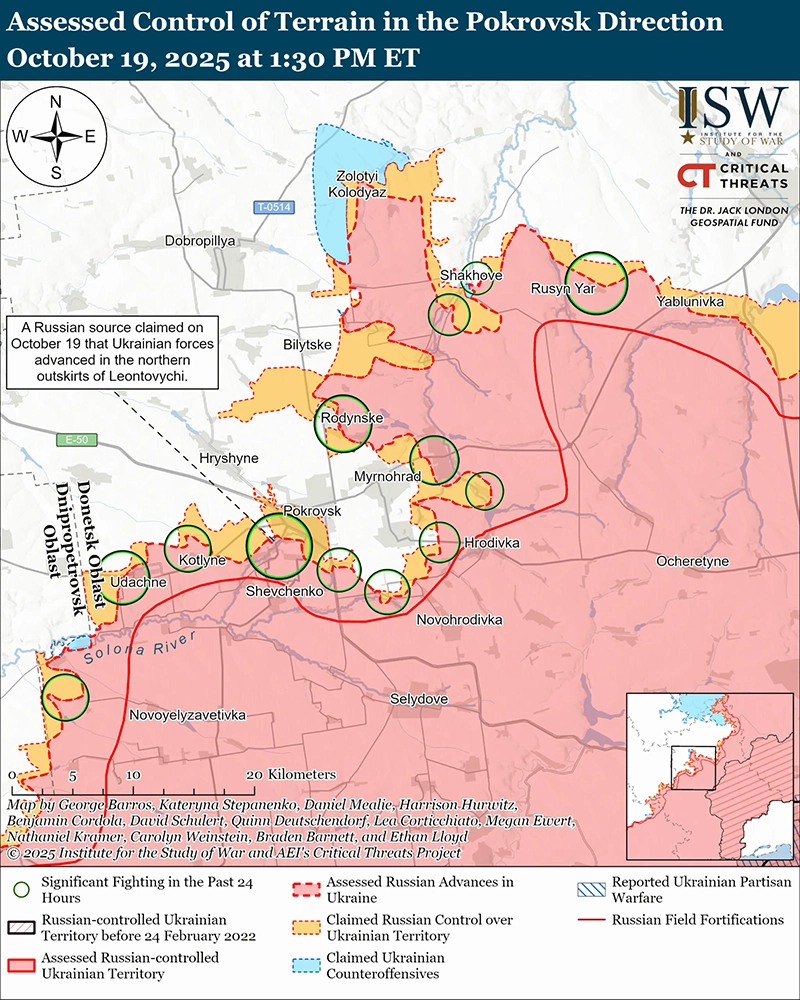Российские войска атаковали под самим Покровском; севернее Покровска в районе Родинского; северо-восточнее Покровска в районе Новоэкономического, Красного Лимана и Миролюбовки; восточнее Покровска у Мирнограда; юго-восточнее Покровска в районе Сухого Яра и Лысовки; и юго-западнее Покровска в районе Зверево, Котлино, Удачного и Молодецкого 18 и 19 октября. [61]
