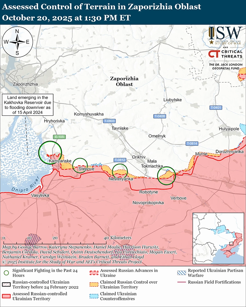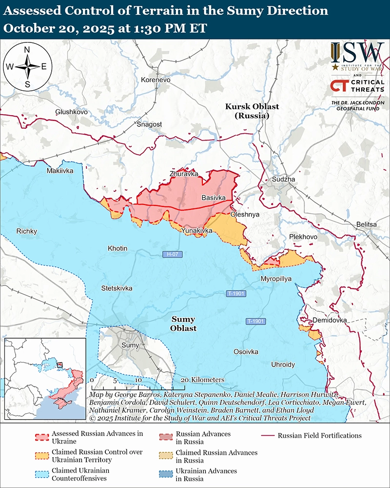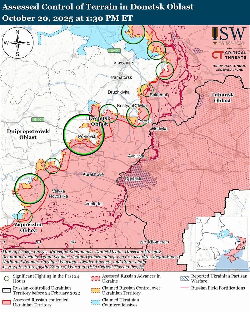 Кремлевские чиновники пытаются представить Украину в качестве препятствия на пути к миру, чтобы скрыть то, как сам Путин препятствует этому процессу, настаивая на том, чтобы Украина уступила больше территории, чем в настоящее время оккупируют российские войска. Генеральный директор Российского фонда прямых инвестиций (РФПИ) и ключевой переговорщик от Кремля Кирилл Дмитриев заявил 19 октября, что Украина и Европа подрывают мирный процесс под руководством США. [26] Зеленский в последние месяцы соглашался на каждое из предложенных Трампом немедленных перемирий на текущем фронте, в то время как Путин отвергал все из них. [27] Кремль продвигает ложный нарратив о том, что Россия неизбежно захватит территорию, которую она требует, и что поэтому Украина несет ответственность за затягивание войны, отказываясь от превентивной капитуляции. Однако в действительности российские войска предпринимают ползучие, незначительные территориальные успехи с очень высокими потерями, потому что Путин неоднократно отвергал американские и украинские предложения о прекращении огня и по-прежнему полон решимости бороться за большую территорию, чем сейчас контролирует Россия. [28] Россия, а не Украина, неоднократно демонстрировала, что причиной отсутствия мира является ее отказ от компромиссов или добросовестных переговоров.