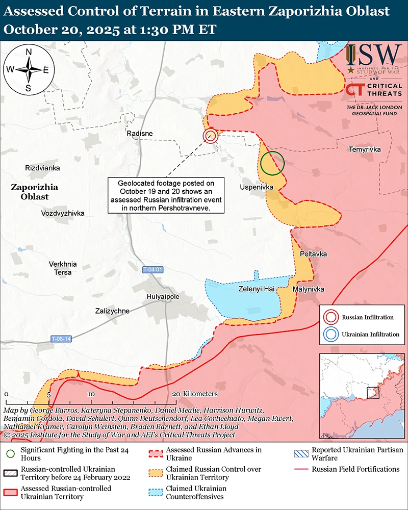 20 октября российские войска продолжили ограниченные наземные атаки на Гуляйпольском направлении, но не добились подтвержденных успехов.