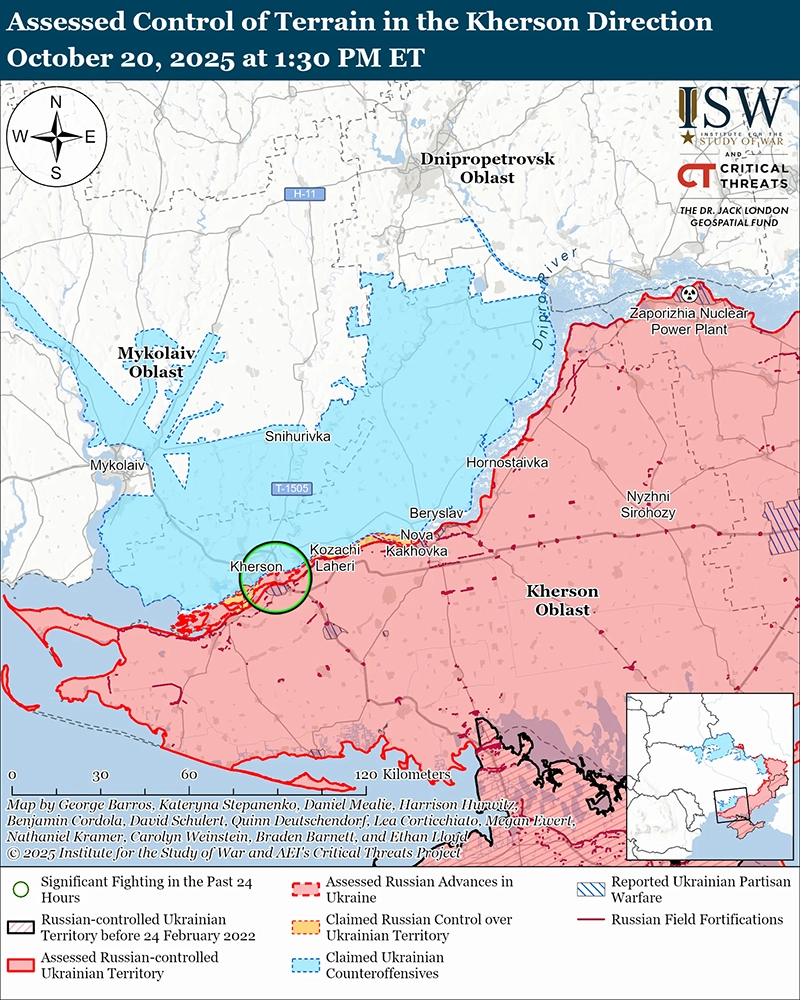 19 и 20 октября российские войска продолжили ограниченные атаки к востоку от Херсона в районе Антоновского шоссе и железнодорожных мостов. [106]