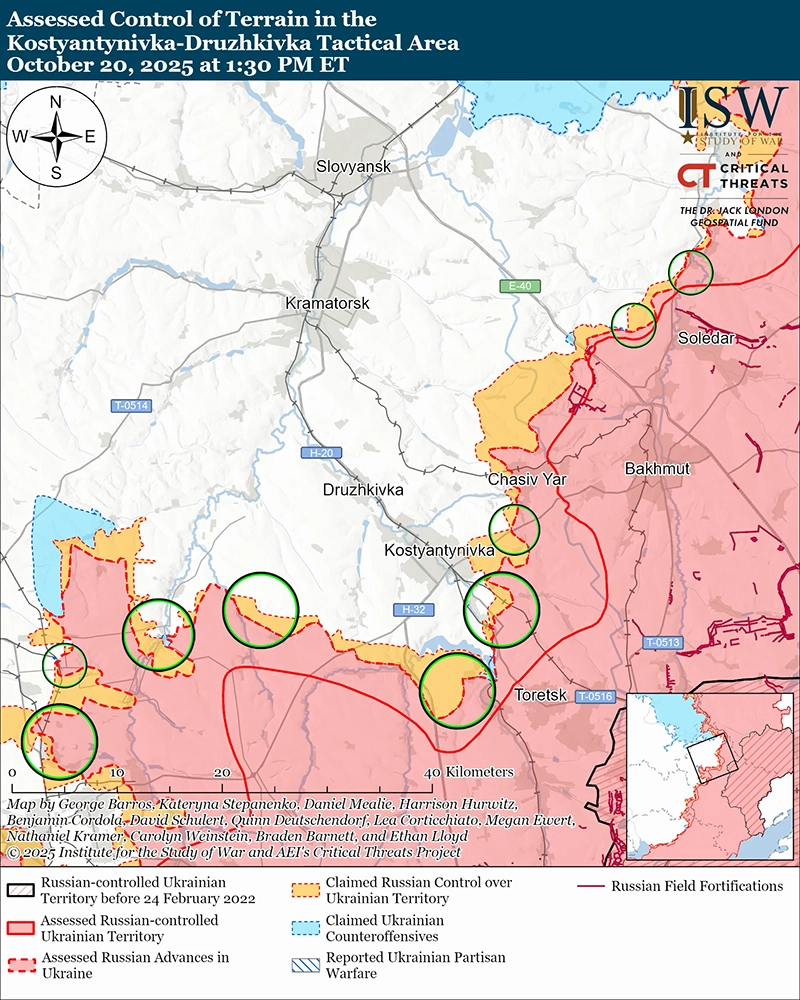 Враг атаковал в районе Константиновки; северо-восточнее Константиновки в районе Часова Яра; к востоку от Константиновки в районе Ступочек; юго-восточнее Константиновки в районе Александро-Шультино; к югу от Константиновки в районе Катериновки; юго-восточнее Константиновки в районе Торецка, Плещеевки и Щербиновки; южнее Дружковки в районе Русиного Яра и Полтавки; и юго-западнее Дружковки в районе Владимировки и Софиевки 19 и 20 октября. [62] Российские военные блогеры утверждали, что украинские войска контратаковали во Владимировке. [63]