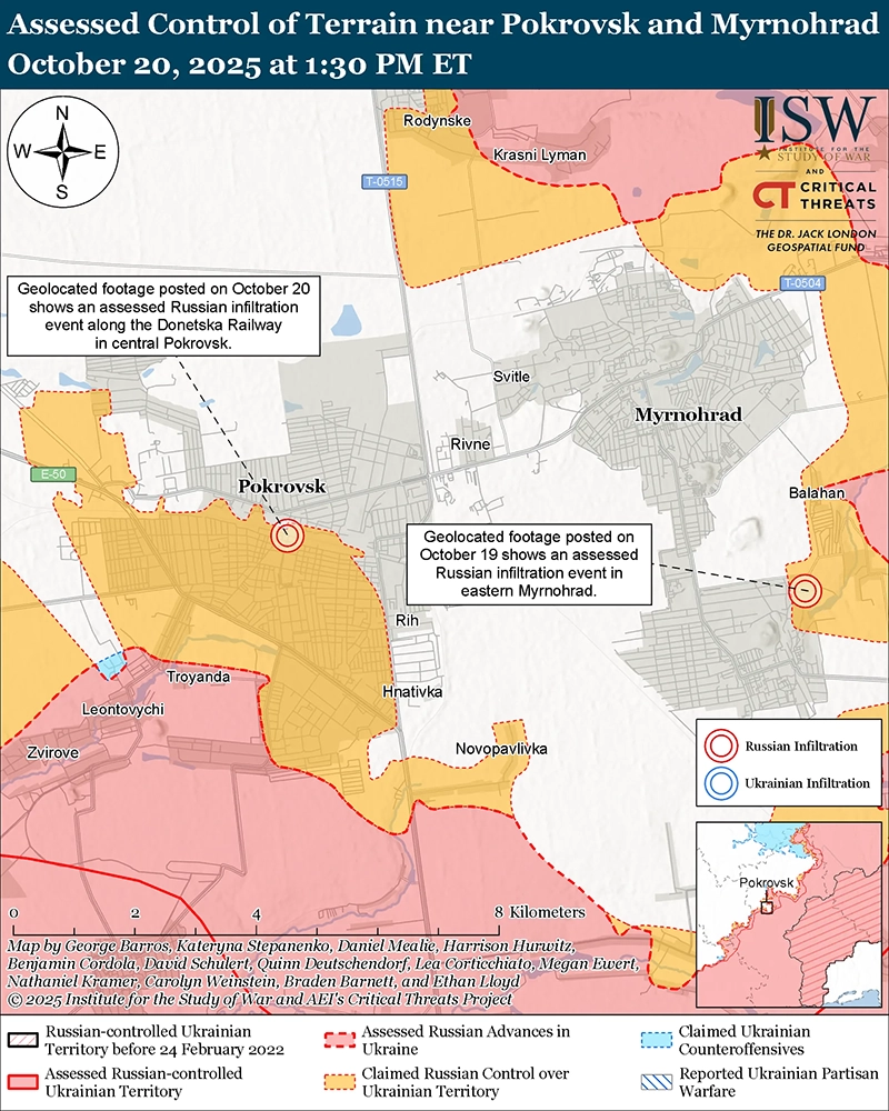 На геолоцированных кадрах, опубликованных 19 октября, видно, как украинские войска наносят удары по российским позициям в здании вдоль улицы Постышева в восточной части Мирнограда после того, как российские войска провели, по оценкам ISW, миссию по проникновению. [76] На геолоцированных кадрах, опубликованных 20 октября, видно, как украинские войска наносят удары по российским позициям в восточной части Покровска и вдоль железной дороги в центре Покровска после того, что, по оценкам ISW, было российскими миссиями по проникновению. [77] ISW считает, что эти миссии по проникновению не изменили контроль над местностью или передним краем района боевых действий (FEBA) в настоящее время. Украинский 7-й корпус оперативного реагирования Десантно-штурмовых войск 20 октября сообщил, что российские диверсионно-разведывательные группы проникли в центр Покровска и убили несколько мирных жителей в районе железнодорожного вокзала. [78] В корпусе сообщили, что украинские войска ликвидировали группу, прятавшуюся на железнодорожной станции, и уничтожили 14 российских солдат, вошедших в Покровск за последние два дня. В корпусе сообщили, что российские войска пытаются расширить спорную «серую зону» в пределах Покровска и проникнуть в населенный пункт с нескольких направлений.