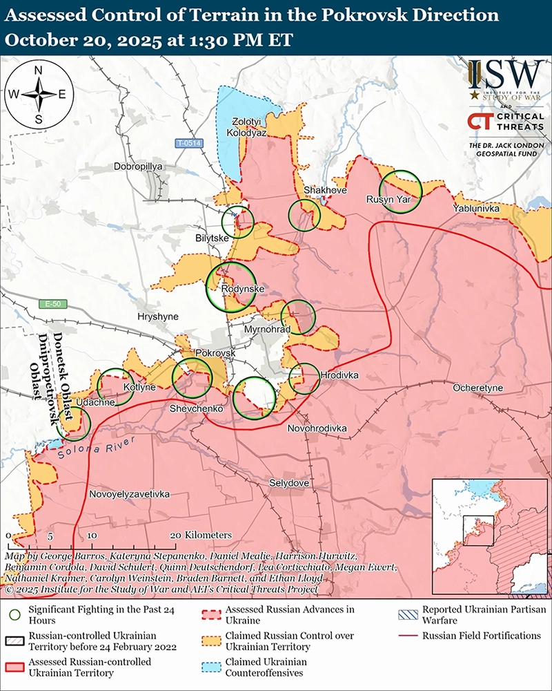 Российские войска атаковали под самим Покровском; севернее Покровска в районе Родинского; северо-восточнее Покровска в районе Красного Лимана, Казацкого и Новоэкономического; к востоку от Покровска у Мирнограда, Балагана и Проминя; юго-восточнее Покровска в районе Лысовки и Сухого Яра; и юго-западнее Покровска в районе Котлино, Зверево, Молодецкого и Удачного 19 и 20 октября. [74] Российский военный блогер утверждал, что украинские войска контратаковали в районе Балагана, Казацкого и Федоровки (к северо-востоку от Покровска). [75]