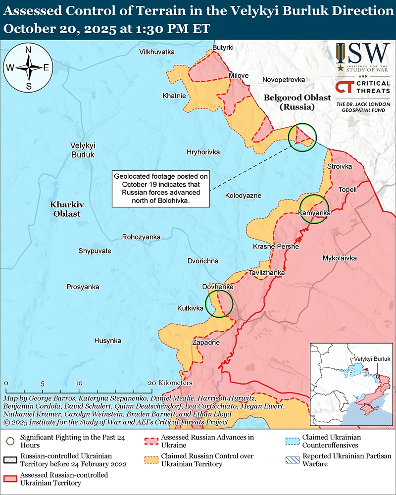 Оценка российского продвижения: геолоцированные кадры, опубликованные 20 октября, указывают на то, что российские войска недавно продвинулись к северу от Бологовки (к востоку от Великого Бурлука). [37]