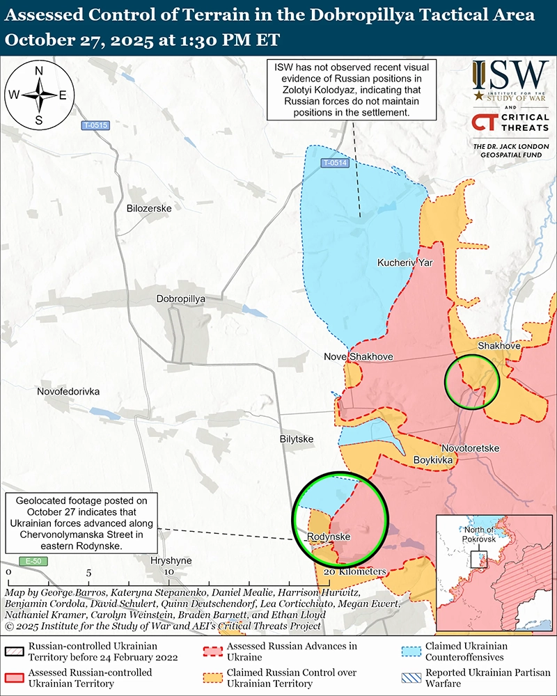 Как украинские, так и российские войска продолжают продвигаться в Покровском направлении, подчеркивая изменчивый и перемешанный характер линии фронта на этом участке фронта. Геолоцированные кадры, опубликованные 27 октября, указывают на то, что российские войска недавно продвинулись на улице Нахимова в западной части Покровска. [22] На дополнительных геолоцированных кадрах, опубликованных 27 октября, видно, как украинские войска атакуют российские позиции в восточном Родинском (к северу от Покровска), что указывает на недавнее продвижение украинских войск в этом районе. [23] Украинская бригада, опубликовавшая кадры, сообщила, что украинские войска контролируют Родинское и что ограниченная российская пехота вошла на окраины населенного пункта. [24] Украинский военный обозреватель Константин Машовец сообщил, что украинские войска уничтожили все три единицы российской бронетехники в ходе недавнего взводного механизированного штурма в районе Красного Лимана (к юго-востоку от Родинского), но небольшие группы российской пехоты впоследствии вошли в южную часть Родинского. [25] Машовец заявил, что небольшие российские группировки пытаются удерживать позиции в населенном пункте, а украинские войска контратаковали.