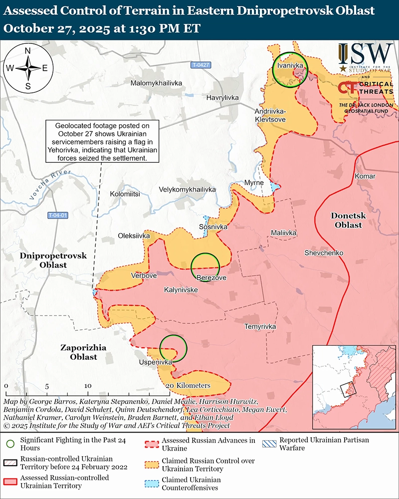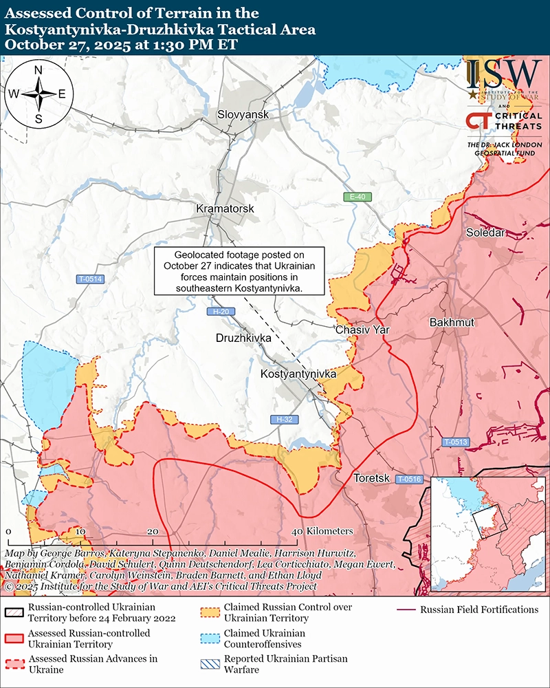 Уточнение территорий под российскими заявлениями: геолоцированные кадры, опубликованные 27 октября, указывают на то, что украинские войска удерживают позиции в юго-восточной части Константиновки, в районе, где, как ранее утверждали российские источники, российские войска сохраняют присутствие. [73]