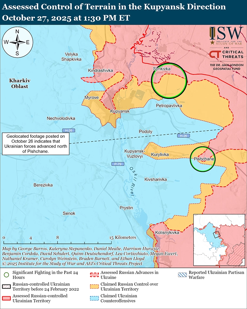 Оценка украинского продвижения: геолоцированные кадры, опубликованные 26 октября, указывают на то, что украинские войска недавно продвинулись к северу от Песчаного (к юго-востоку от Купянска). [61]