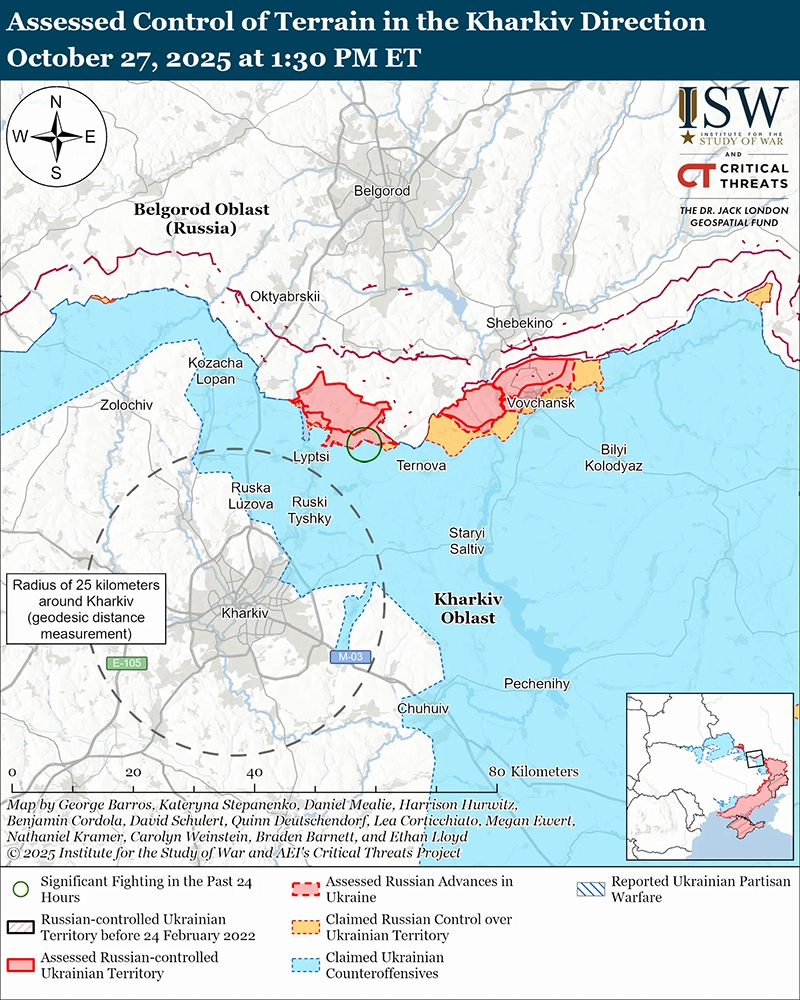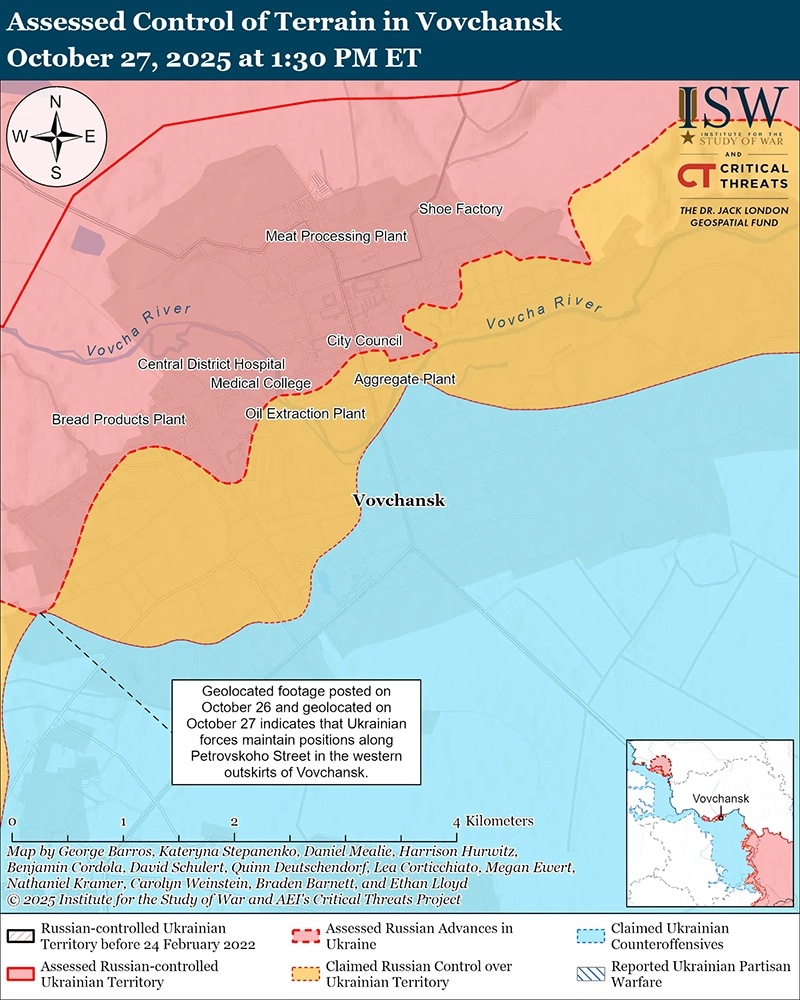 Уточнение территорий под российскими заявлениями: геолоцированные кадры, опубликованные 26 октября, указывают на то, что украинские войска удерживают позиции в западном Волчанске в районе, где, как ранее утверждали российские источники, российские войска сохраняли присутствие. [54]
