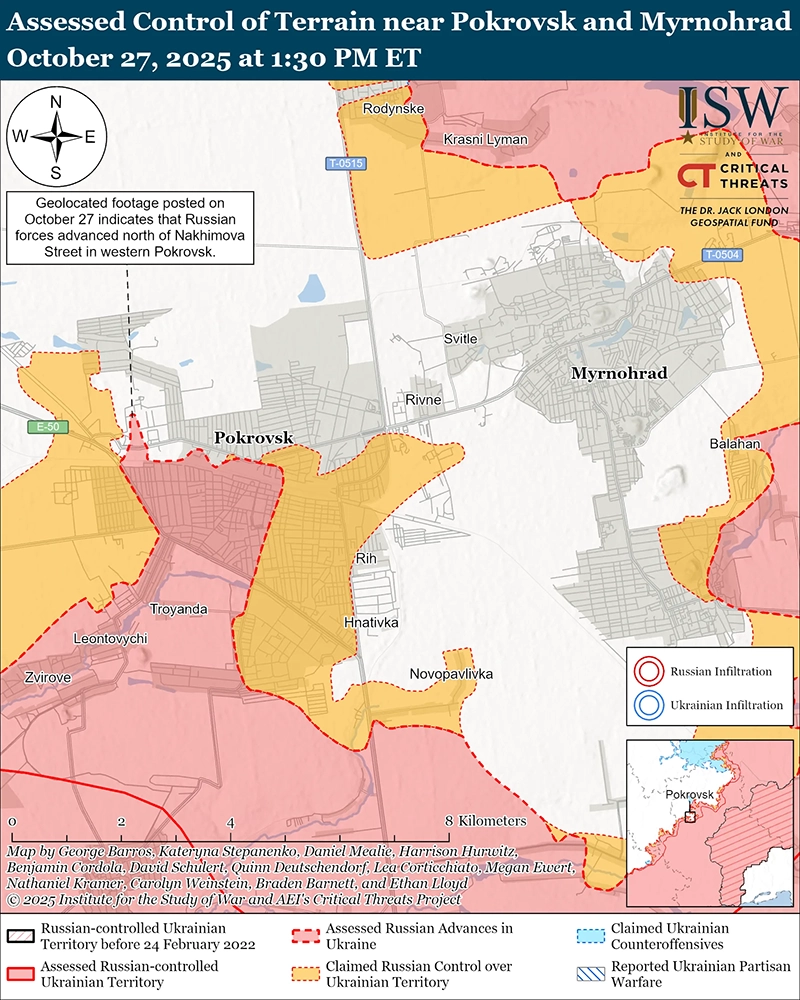 Украинские источники продолжают отмечать пористый характер линии фронта и зависимость России от миссий по проникновению в Покровск. Командир украинского взвода, действующего на Покровском направлении, заявил, что в Покровске скопилось около 200 российских военных, где они вступают в перестрелки с украинскими силами. [29] Командир взвода сообщил, что российские войска проникли в город огневыми группами по два-три человека и ждут подкрепления в укрытиях и подвалах. В 7-м корпусе оперативного реагирования Воздушно-десантных войск Украины 27 октября сообщили, что российские силы, скопившиеся в Покровске, не опираются на оборонительную позицию с прикрытием и маскировкой. [30] Машовец отметил, что определить местоположение украинских и российских позиций в Покровске сложно, поскольку российские войска проводят операции по проникновению небольших групп между украинскими линиями, часто прибегая к вероломству, чтобы замаскироваться под украинских гражданских лиц. [31] По сообщениям Машовца, российские войска действуют в центре Покровска в районе железнодорожного вокзала и на юге Покровска, но удерживают позиции в районе Собачовка (восточный Покровск), в центре города и на железнодорожном вокзале. По оценке Машовца, украинские силовики наверняка контролируют район к северу от железнодорожной станции. [32]