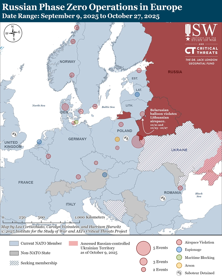 Воздушные шары, прилетающие в Литву из воздушного пространства Беларуси, препятствуют работе Вильнюсского аэропорта. Вильнюсский аэропорт сообщил, что литовские власти временно приостановили все воздушное сообщение в аэропорту в ночь с 26 на 27 октября из-за неустановленного количества воздушных шаров, летящих в сторону аэропорта. [41] Премьер-министр Литвы Инга Ругинене отметила, что воздушные шары летели со стороны воздушного пространства Беларуси и что это уже третий день подряд и четвертый раз за прошедшую неделю, когда воздушные шары из воздушного пространства Беларуси вынудили Вильнюсский аэропорт временно прекратить полеты. [42] Пограничная служба Литвы сообщила, что с вечера 26 октября закрыла сухопутные пограничные переходы с Беларусью из-за белорусских воздушных шаров, а министр внутренних дел Литвы Владислав Кондратович заявил, что граница с Беларусью будет закрыта на неопределенный срок. [43] В Пограничной службе Литвы сообщили, что закрытие границы не коснется граждан Литвы, граждан Европейского союза (ЕС) и дипломатов. [44] 27 октября Ругинене заявила, что литовские войска примут все необходимые меры, чтобы сбить эти аэростаты, чтобы «послать сигнал Беларуси, что Литва не потерпит гибридных атак». [45] ISW продолжает считать, что Россия все чаще участвует в тайных и открытых атаках на Европу и что продолжающиеся нарушения воздушного пространства России и неконвенциональная деятельность, вероятно, являются частью «Фазы ноль» – более широкой фазы создания информационных и психологических условий в России – для подготовки к возможной войне между НАТО и Россией в будущем. [46] ISW продолжает считать, что Беларусь де-факто является воюющей стороной России в войне в Украине, поэтому белорусские вторжения в воздушное пространство НАТО являются частью более широких усилий России в рамках «Нулевой фазы». [47]