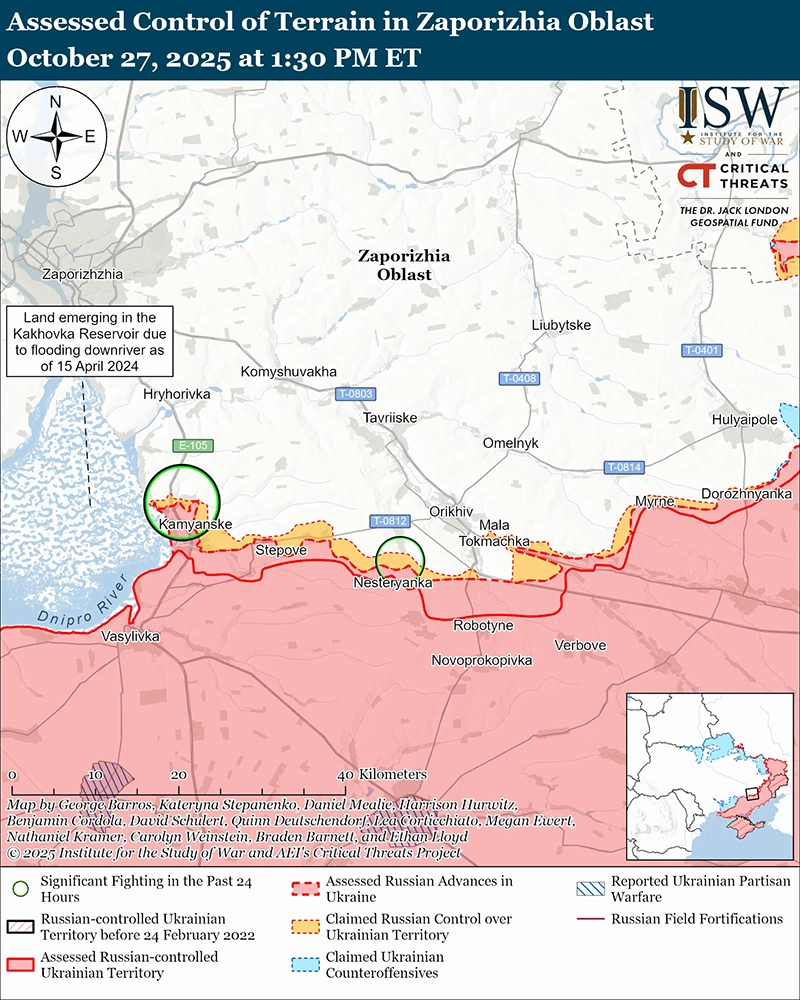 Российские войска атаковали к юго-востоку от Орехова в направлении Новоданиловки; юго-западнее Орехова в районе Новоандреевки; и к западу от Орехова в районе Степногорска, Плавни, Приморского, Степного и Каменского 26 и 27 октября. [104]