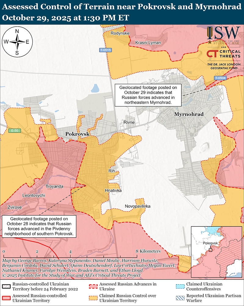 Российские войска, вероятно, потратят большое количество живой силы и техники, чтобы закрыть украинский котел на Покровском направлении, как они делали в течение последних 18 месяцев боев за Покровск. 7-й корпус оперативного реагирования Десантно-штурмовых войск Украины сообщил 29 октября, что российские войска сосредоточили 11 000 человек личного состава для наступления на Покровск и перебросили в общей сложности 29 000 человек личного состава в зону ответственности корпуса. [20] 7-й корпус быстрого реагирования опубликовал карту, на которой указано, что российские войска в настоящее время атакуют в трех разных районах: к северу от Покровска в сторону Родинского, к востоку от Покровска в Мирнограде и восточном Покровске и в Покровске с юга. По оценкам корпуса, российские войска, вошедшие в южный Покровск, намерены атаковать в северо-западном Покровске, а затем в Гришино (к северо-западу от Покровска) и восточном Покровске. Российские войска в основном выполняют задачи по проникновению в Покровск и в настоящее время не осуществляют контроля, необходимого для полного вытеснения украинских войск из города и создания прочных позиций. Российским войскам, вероятно, придется угрожать всему украинскому котлу неминуемым окружением, чтобы захватить Покровск и Мирноград без боев на всем протяжении обоих населенных пунктов. Однако российские войска с трудом продвигаются на восточном и северо-восточном флангах Покровского района, чтобы поддержать эту более масштабную операцию по окружению по всему котлу. [21] Российские войска ведут бои за захват Покровска с февраля 2024 года и тратят в боях значительное количество живой силы и техники, потери в основном из-за ударов украинских беспилотников, которые сдерживали российское продвижение в этом районе на протяжении большей части российской кампании. [22]