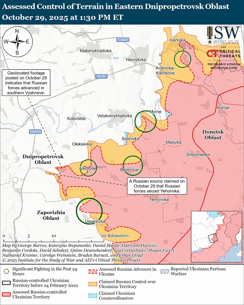 Оценка украинского продвижения: геолоцированные кадры, опубликованные 29 октября, указывают на то, что украинские войска недавно продвинулись в северное Дорожное (к юго-востоку от Доброполья). [72]