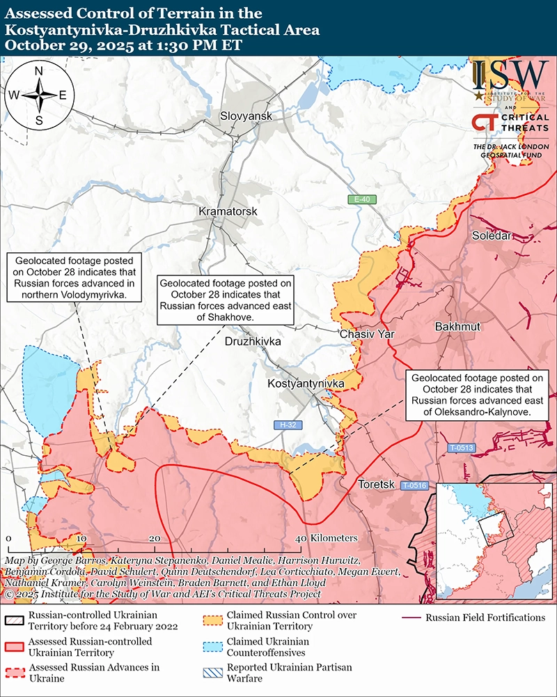 Оценка российского продвижения: геолоцированные кадры, опубликованные 28 октября, указывают на то, что российские войска недавно продвинулись к востоку от Александро-Калиново (к югу от Константиновки) и к северо-востоку и в северную часть Владимировки (к юго-западу от Дружковки) во время механизированного штурма батальона 27 октября. [64]