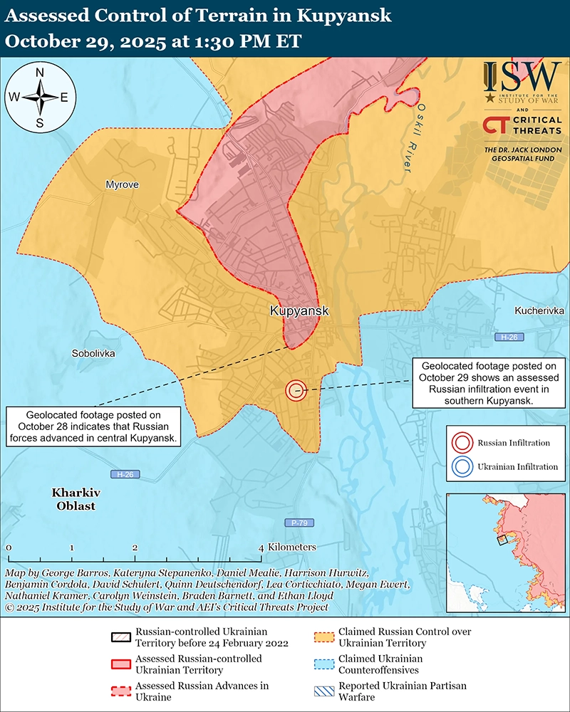 Оценка российского продвижения: геолоцированные кадры, опубликованные 28 октября, указывают на то, что российские войска недавно продвинулись в центре Купянска. [52]