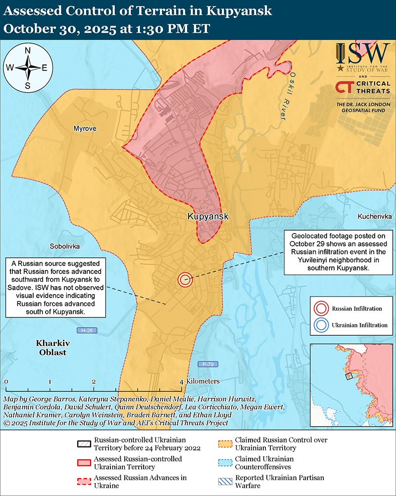 На геолоцированных кадрах, опубликованных 29 октября, видно, как украинские войска наносят удары по оккупированному Россией зданию на юге Купянска после того, что, по оценкам ISW, является миссией по проникновению. [50] ISW считает, что эта миссия по проникновению не изменила контроль над местностью или передним краем района боевых действий (FEBA).