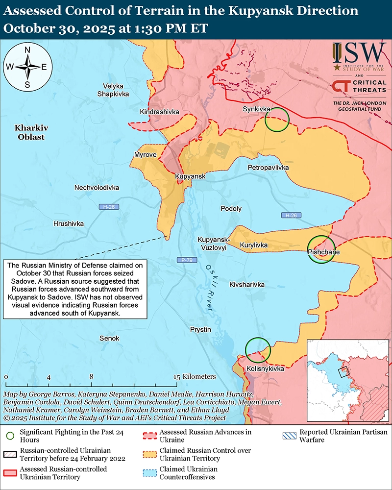 Неподтвержденные утверждения: 30 октября Министерство обороны России и российские военные блогеры заявили, что российские войска захватили Садовое (к югу от Купянска) и продвинулись на юго-западе Купянска. [46] Российский военный блогер утверждал, что российские войска продвинулись к северо-западу и северо-востоку от Садового, а Осиновое (к югу от Садового) является оспариваемой «серой зоной». [47] ISW не обнаружил доказательств того, что российские войска продвинулись к югу от Купянска.