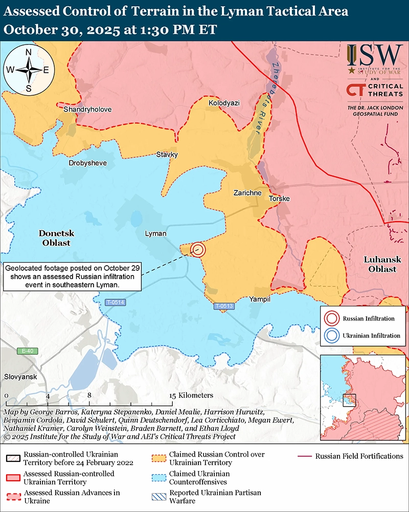 Уточнение территорий под российскими претензиями: геолоцированные кадры, опубликованные 29 октября, указывают на то, что украинские войска удерживают позиции или недавно продвинулись в южной части Новоселовки (к северо-западу от Лимана), в районе, где, как ранее утверждали российские источники, российские войска сохраняют присутствие. [53]