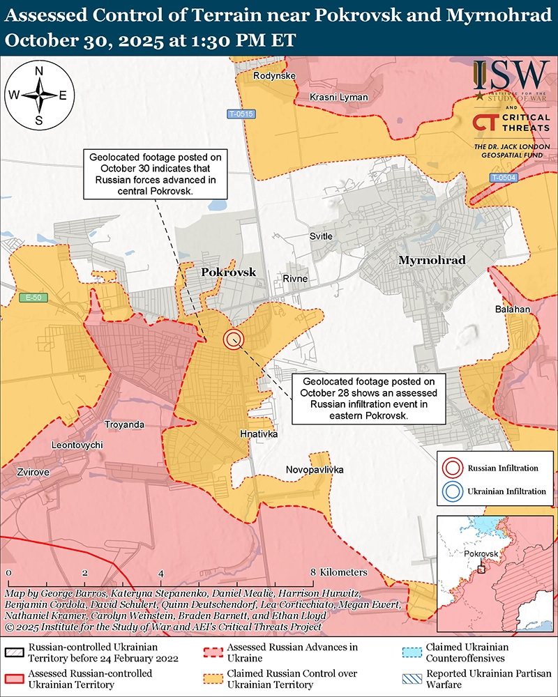 Украинские военные источники продолжают сообщать подробности о сложной ситуации в Покровском котле. Украинские солдаты и командиры, действующие на Покровском направлении, продолжают указывать на то, что российские задачи по проникновению и накоплению сил осложняют украинские штурмовые и оборонительные операции, а также усилия по контролю за передвижениями россиян в Покровском котле. [8] Украинский 7-й корпус быстрого реагирования Десантно-штурмовых войск сообщил, что российские войска используют плохую погоду, чтобы возобновить тактику проникновения в Покровском направлении, чтобы увеличить масштабы российских успехов. [9] Командир украинской бригады сообщил, что сильные осенние дожди не позволяют российским войскам наладить логистику в Покровске. [10] Оба украинских источника указали, что российские беспилотники успешно перехватывают украинские наземные линии коммуникаций (НЛК) в Покровск и Мирноград и внутри него. [11] Связанный с Кремлем российский военный блогер заявил, что операторы дронов российского Центра передовых беспилотных технологий «Рубикон» установили на Покровском направлении беспилотный эквивалент «превосходства в воздухе». [12] Украинские военные источники сообщали, что российские войска, в том числе операторы беспилотников, продолжают переодеваться в гражданскую одежду, что является вероломством в соответствии с международным правом, чтобы проводить миссии по проникновению незамеченными. [13] На снимке немецкого издания BILD изображен российский солдат, одетый как гражданский и без военных знаков отличия, в многоэтажном здании в Покровске. [14] Украинский главнокомандующий генерал Александр Сырский посетил украинских командиров, действующих на Покровском направлении, и 30 октября сообщил, что российские заявления об окружении украинских сил в Покровске или Мирнограде являются ложными. [15]