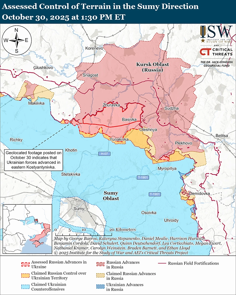 Оценка украинского продвижения: геолоцированные кадры, опубликованные 30 октября, указывают на то, что украинские войска недавно продвинулись в восточной части Константиновки (к северу от города Сумы на международной границе). [33] Кадры указывают на то, что украинские силовики, вероятно, освободили Кондратовку (к югу от Константиновки) ранее.