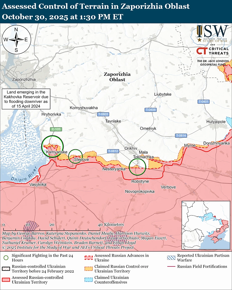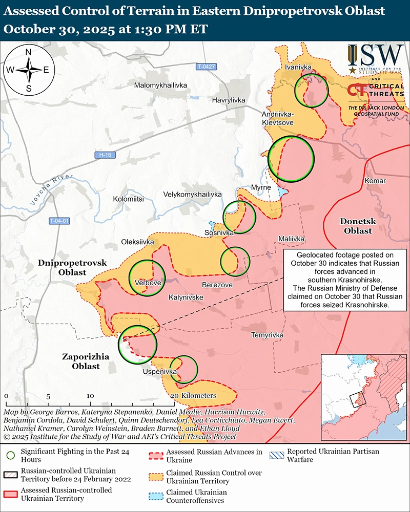 Оценка продвижения российских войск: на геолоцированных кадрах, опубликованных 30 октября, видно, как российский военнослужащий поднимает российский флаг в центре Красногорского (к северу от Гуляйполя), что указывает на то, что российские войска недавно продвинулись к югу от Красногорского и к западу от Красногорского и Привольного на восточном (левом) берегу реки Янчур. [97]
