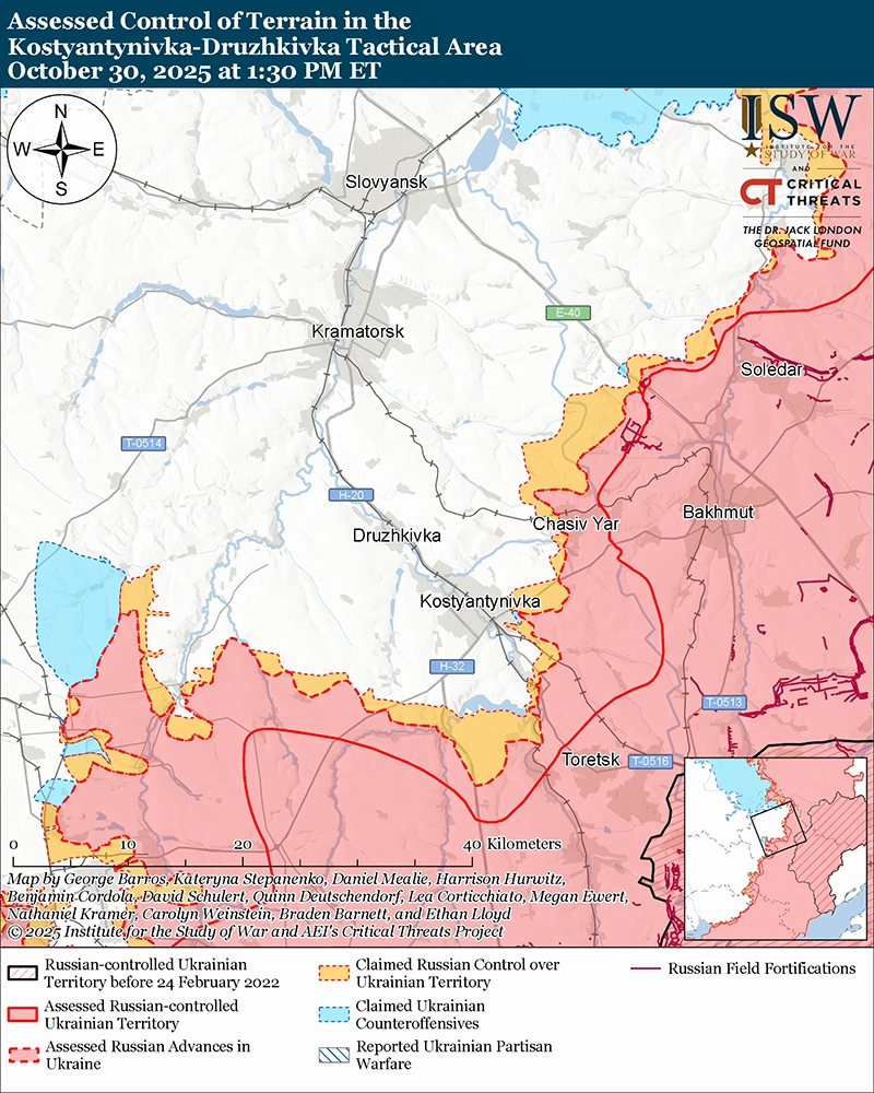 Уточнение территорий под российскими заявлениями: геолоцированные кадры, опубликованные 29 октября, указывают на то, что украинские войска удерживают позиции или недавно продвинулись к востоку от Владимировки (к юго-западу от Дружковки), в котором, как ранее утверждали российские источники, российские войска сохраняют присутствие. [68]