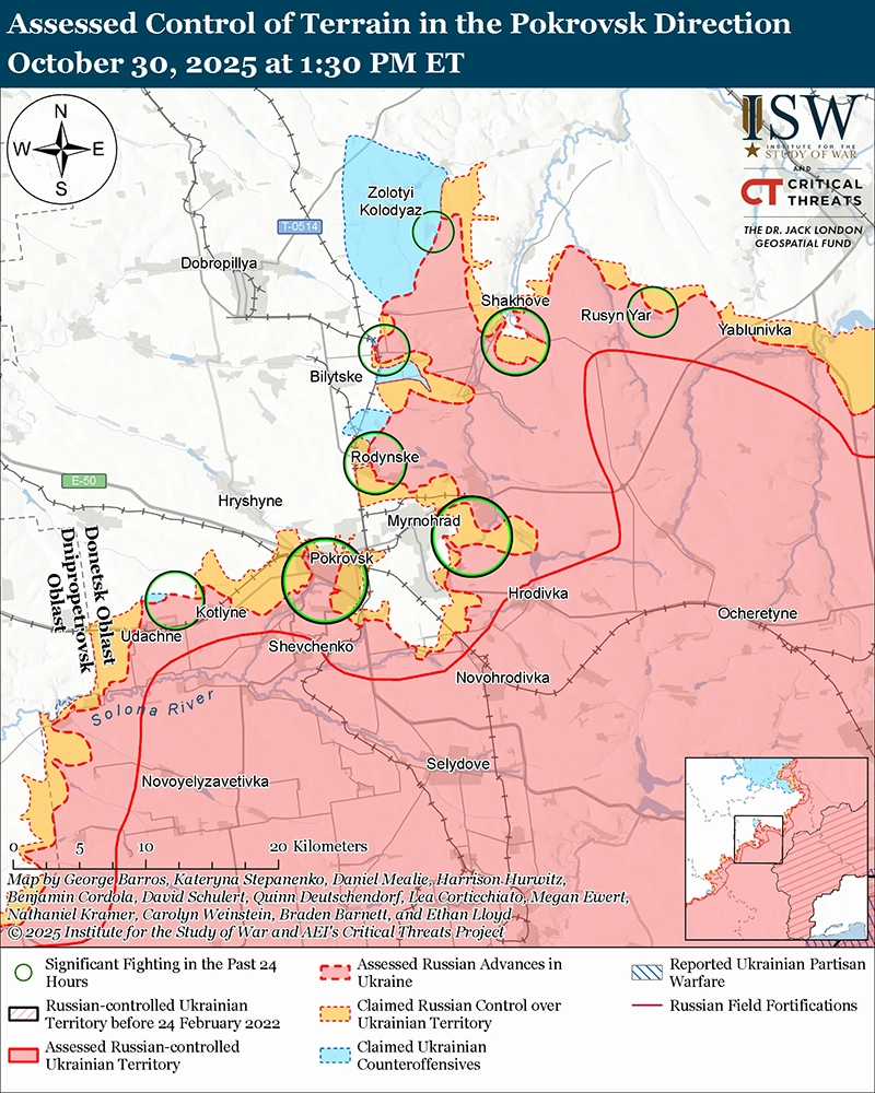 Российские войска продолжали наземные атаки вблизи и в самом Покровске; севернее Покровска в районе Родинского; северо-восточнее Покровска в районе Новоэкономического и Красного Лимана; к востоку от Покровска в районе Гнатовки, Рога, Мирнограда и Балагана; юго-восточнее Покровска в районе Лысовки; южнее Покровска в районе Чунышино и Новопавловки; юго-западнее Покровска в районе Зверево, Удачного, Котлино и Молодецкого; и северо-западнее Покровска в сторону Гришино 29 и 30 октября. [85]