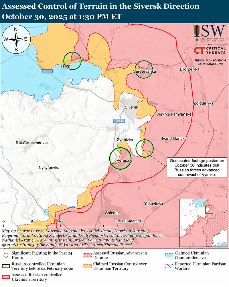 Оценка российского продвижения: геолоцированные кадры, опубликованные 30 октября, указывают на то, что российские войска недавно продвинулись к юго-западу от Выемки (к югу от Северска). [63]