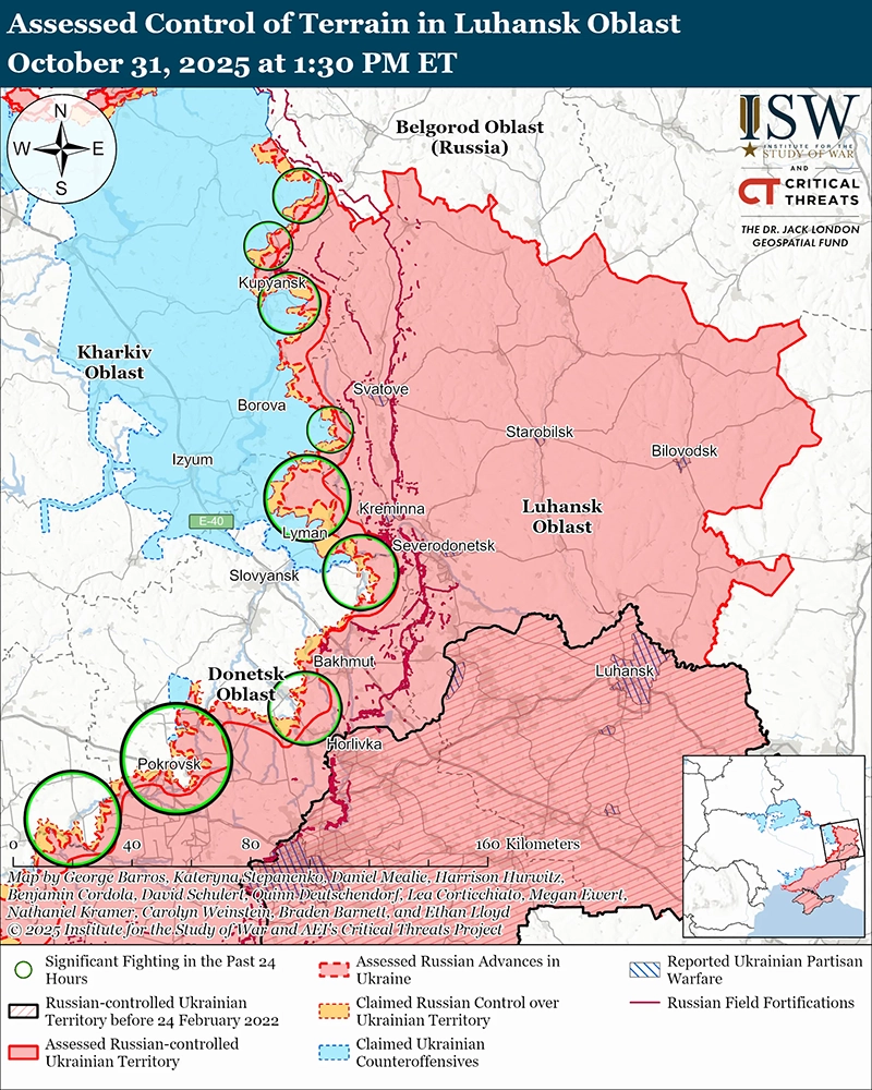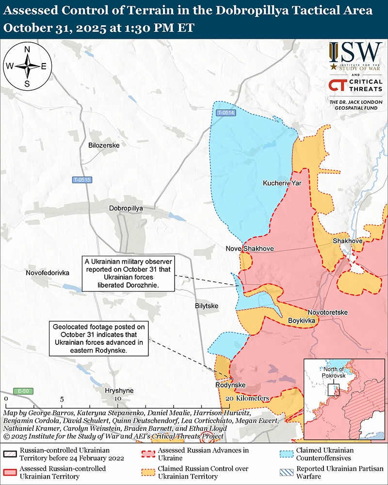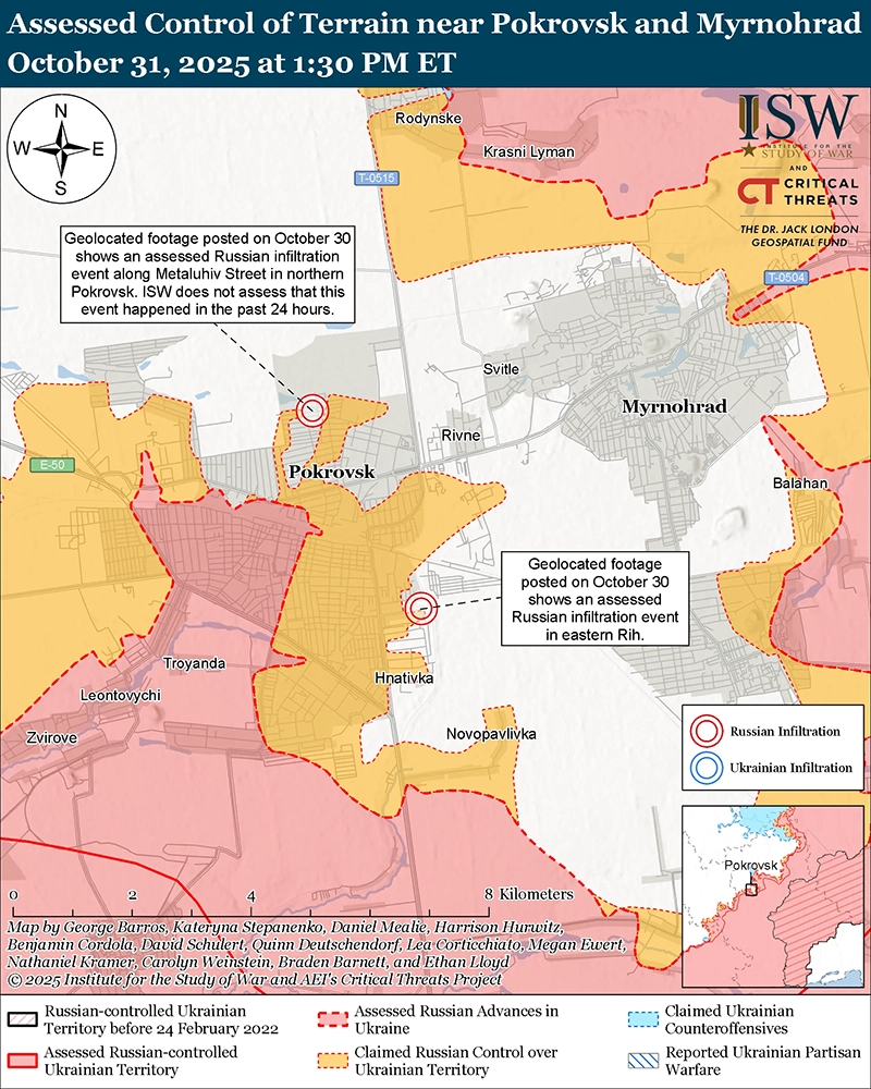 Украинские войска незначительно продвинулись в ходе недавних контратак к северу от Покровска, поскольку российские войска продолжают проникать в Покровск и к востоку от Мирнограда (к востоку от Покровска). Геолоцированные кадры, опубликованные 31 октября, указывают на то, что украинские войска в последнее время незначительно продвинулись в восточном Родинском (к северу от Покровска). [1] На дополнительных геолоцированных кадрах, опубликованных 30 октября, видно, как украинские войска наносят удары по российским позициям на севере Покровска и в восточной части Рога (непосредственно к востоку от Покровска) после того, что, по оценкам ISW, является миссией по проникновению. [2] ISW считает, что эти миссии по проникновению не изменили контроль над местностью или передним краем района боевых действий (FEBA). Источник, предположительно связанный с украинской военной разведкой, заявил 29 октября, что российские войска проникают в Покровск группами от пяти до 10 человек и что Покровск в основном является спорной «серой зоной». [3] Министерство обороны России заявило, что части 2-й общевойсковой армии (ОА, Центральный военный округ [ЦВО]) продвигаются в Покровске, в том числе в районе железнодорожного вокзала Покровск в центре Покровска, и что подразделения 5-й мотострелковой бригады (51-я ОА, ранее известная как 1-й армейский корпус Донецкой Народной Республики [АК ДНР], Южный военный округ [ЮВО]) наступают в Мирнограде. [4] Российские военные блогеры также утверждали, что российские войска продвигаются дальше в Покровске, в восточной части Мирнограда и в районе Родинского. [5] Другой российский военный блогер утверждал, что части 41-й ОА (ЦВО) продвинулись к западу от Покровска в сторону Гришино и продвинулись к трассе М-30 Покровск – Павлоград. [6] Пористый характер линии фронта и распространенность беспилотников в этом районе продолжают осложнять и затемнять тактическую картину в Покровске, и ISW предоставит обновленную оценку по мере прояснения ситуации.