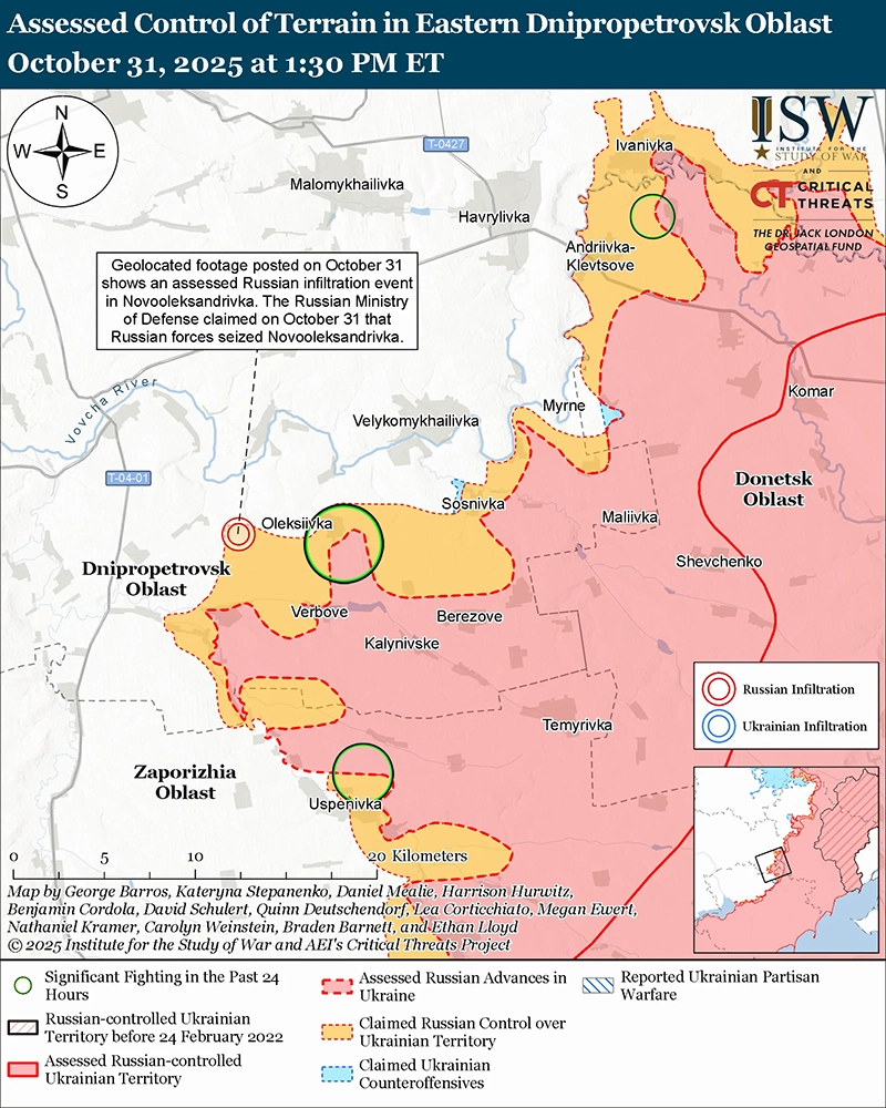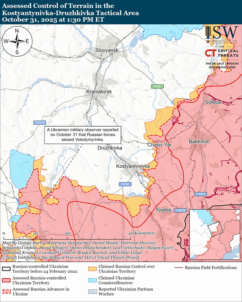 Уточнение территорий под российскими заявлениями: на геолоцированных кадрах, опубликованных 31 октября, показан российский удар по украинским операторам беспилотников к востоку от Константиновки, что указывает на то, что украинские силы либо удерживали позиции, либо недавно продвинулись в районе, где, как ранее утверждали российские источники, российские войска сохраняли присутствие. [44]