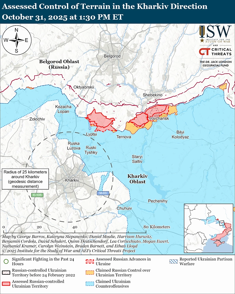 30 и 31 октября российские войска атаковали к северо-востоку от Харькова в районе Волчанска. [29]