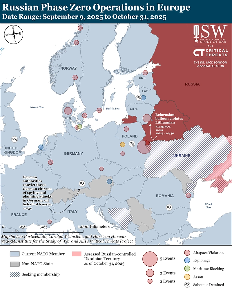 Немецкий суд признал нескольких граждан виновными в сговоре с целью совершения диверсий на территории Германии в пользу России, а литовские власти закрыли аэропорт Вильнюса из-за участившихся воздушных вторжений из белорусского воздушного пространства. Немецкое издание Deutsche Welle (DW) сообщило 30 октября, что немецкий суд признал гражданина Германии и России с двойным гражданством Германии и двух других граждан Германии в шпионаже и сговоре с целью совершения диверсионных актов в Германии в пользу России. [19] DW отметила, что в 2014 году мужчина с двойным гражданством Германии признался в участии в боевых действиях пророссийского ополчения на востоке Украины. Президент Литвы Гитанас Науседа 31 октября заявил, что власти закрыли аэропорт Вильнюса после того, как увидели неустановленное количество воздушных шаров, летящих в сторону аэропорта из воздушного пространства Беларуси. [20] Этот инцидент является самым последним случаем сбоев в работе воздушных шаров вблизи Вильнюсского аэропорта в октябре 2025 года.[21] Литва недавно продлила закрытие сухопутных пограничных переходов с Беларусью в ответ на эти инциденты.[22] ISW оценивает, что воздушные вторжения из Беларуси, скорее всего, связаны с текущей фазой России по созданию информационных и психологических условий «Фазы ноль» — для оценки реагирования НАТО и сбора оперативной информации в рамках подготовки к возможной войне между НАТО и Россией в будущем.[23]