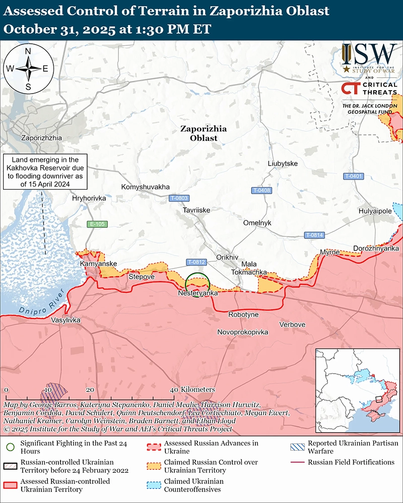 Уточнение территорий под российскими заявлениями: геолоцированные кадры, опубликованные 31 октября, указывают на то, что украинские войска удерживают позиции к юго-западу от Гороховое (к юго-востоку от Новопавловки), в районе, в котором, как ранее утверждали российские источники, российские войска сохраняют свое присутствие. [58]