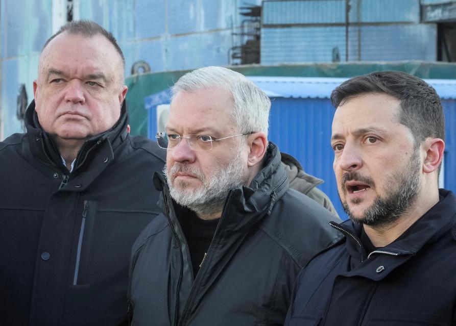 Герман Галущенко (в центре) с главой «Энергоатома» Петром Котиным (слева) и президентом Украины Владимиром Зеленским 13 февраля. (Глеб Гаранич/Reuters)