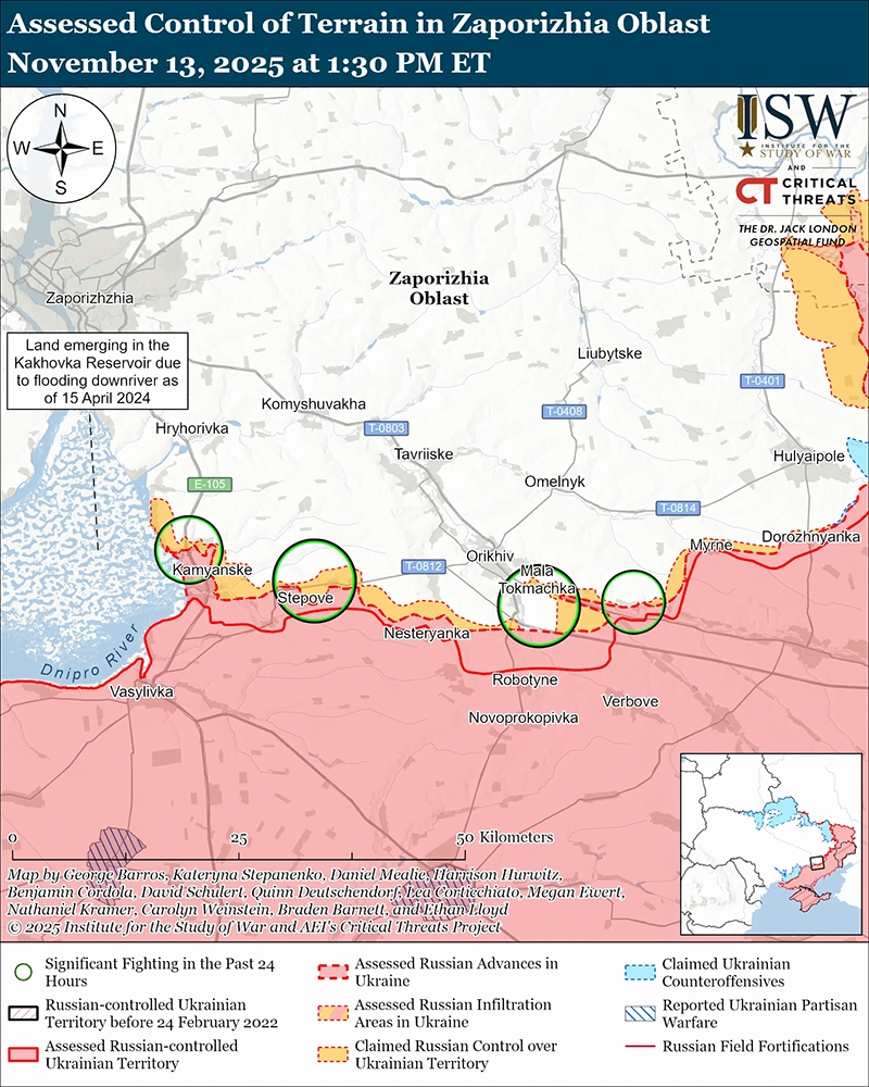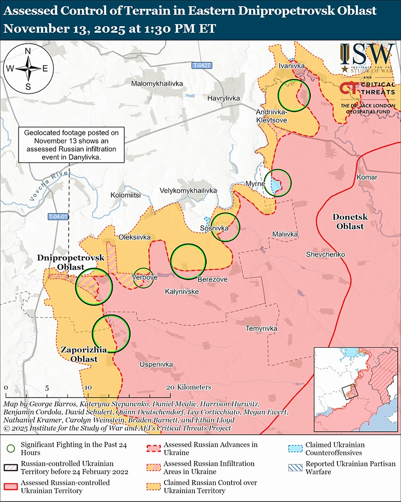 На геолоцированных кадрах, опубликованных 13 ноября, видно, как российские военнослужащие поднимают российские флаги в Даниловке (к юго-западу от Великомихайловки на трассе Т-0401), что, по оценкам ISW, было миссией проникновения, вероятно, через Цегельное и Егоровку (оба к востоку от Даниловки и к юго-западу от Великомихайловки). [3] Российские источники утверждали, что российские войска захватили Ровнополье (к северо-востоку от Гуляйполя) и что части российской 5-й танковой бригады (36-я ОА, Восточный военный округ [ВВО]) захватили Даниловку. [4] Южное оперативное командование Украины сообщило 12 ноября, что украинские войска покинули Ровнополье вечером 11 ноября, а украинский главнокомандующий генерал Александр Сырский заявил 13 ноября, что российские войска действуют в районе Солодки (к северу от Ровнополья), Яблуково (к югу от Ровнополья) и Веселое (к юго-востоку от Ровнополья), что указывает на то, что российские войска продолжают относительно быстрое продвижение к северо-востоку и востоку от Гуляйполя. [5]