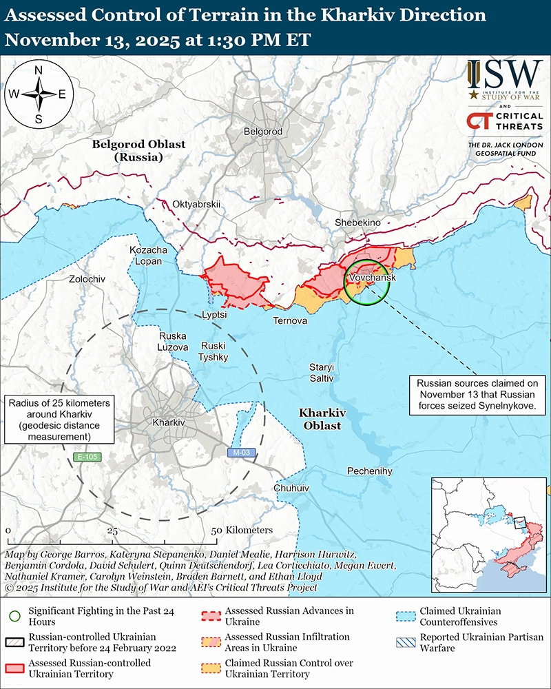 12 и 13 ноября российские войска атаковали к северо-востоку от Харькова в районе Синельниково и Волчанска. [49]