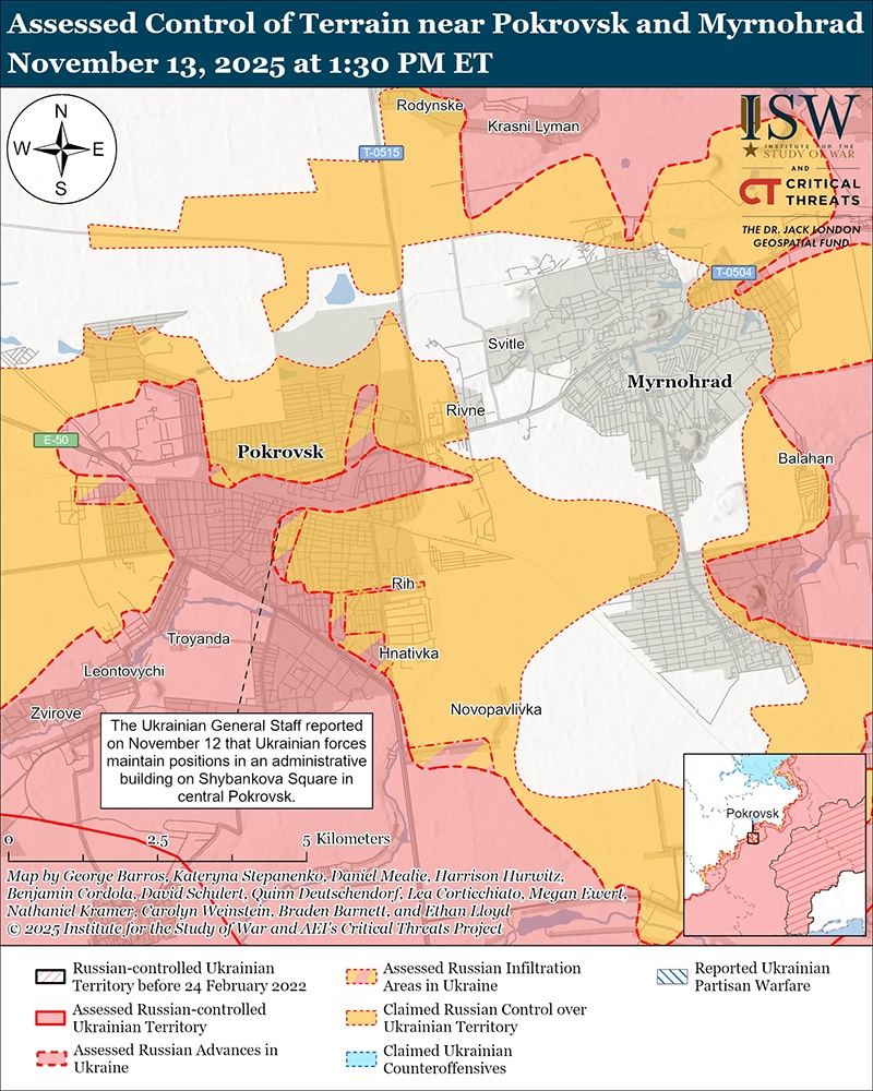 Уточнение территорий под российскими претензиями: геолоцированные кадры, опубликованные 12 ноября, указывают на то, что украинские войска удерживали позиции или недавно продвинулись на юго-восточной окраине Куриловки (к юго-востоку от Купянска) — районе, где, как ранее утверждали российские источники, российские войска сохраняли присутствие. [56]