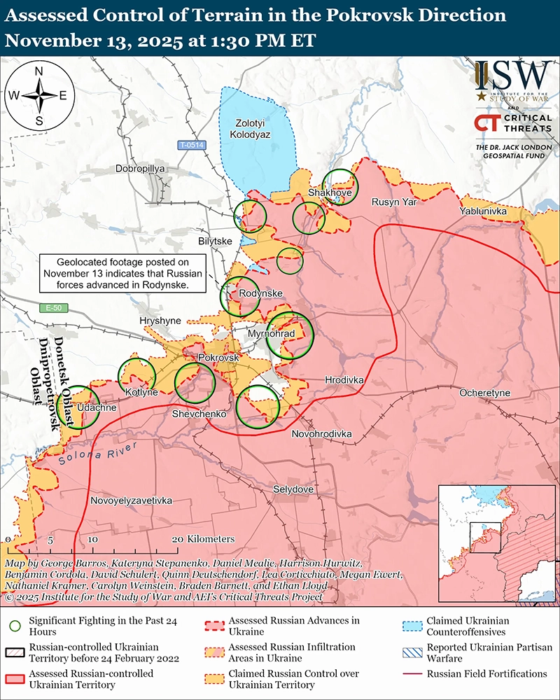 Враг продолжает продвигаться на Покровском направлении, украинские войска продолжают контратаки. Российские войска продолжают попытки завершить окружение украинских войск в Покровске и Мирнограде (к востоку от Покровска), продвигаясь через Родинское к северо-востоку от Покровска, но населенный пункт остается оспариваемым. Геолоцированные кадры, опубликованные 13 ноября, указывают на то, что российские войска недавно продвинулись в центре Родинского, а российский военный блогер заявил, что российские войска также продвинулись в южном Родинском. [15] Российский военный блогер признал, что украинские войска закрепились в Родинском. [16]