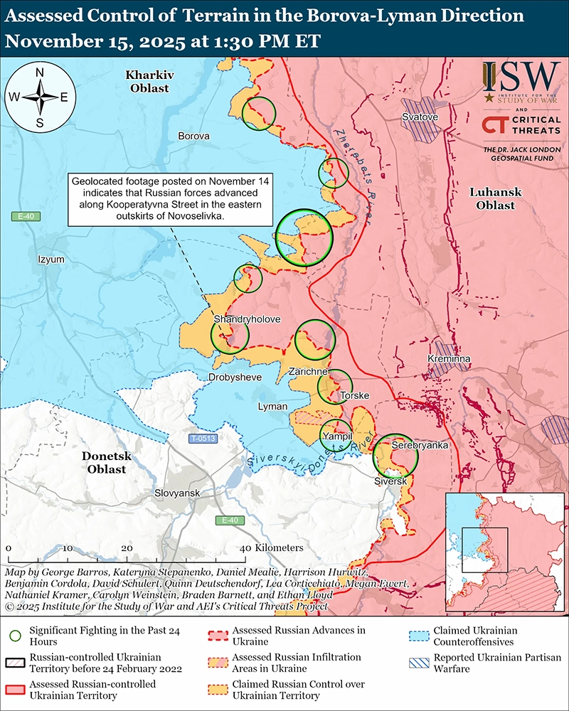 Оценка российского продвижения: геолоцированные кадры, опубликованные 14 ноября, указывают на то, что российские войска недавно продвинулись на восточные окраины Новоселовки (к северо-западу от Лимана). [59]