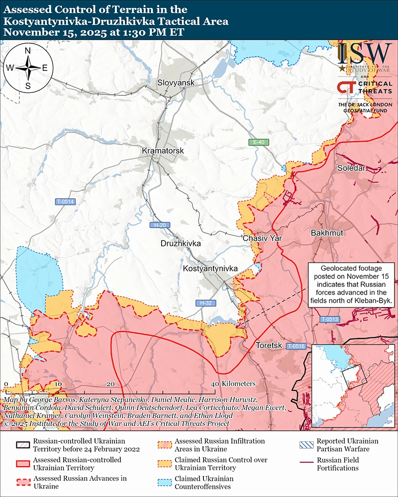 Оценка продвижения России: геолокационные кадры, опубликованные 15 ноября, свидетельствуют о том, что российские войска недавно продвигались к северу от Клебан-Быка (к югу от Константиновки). [66]