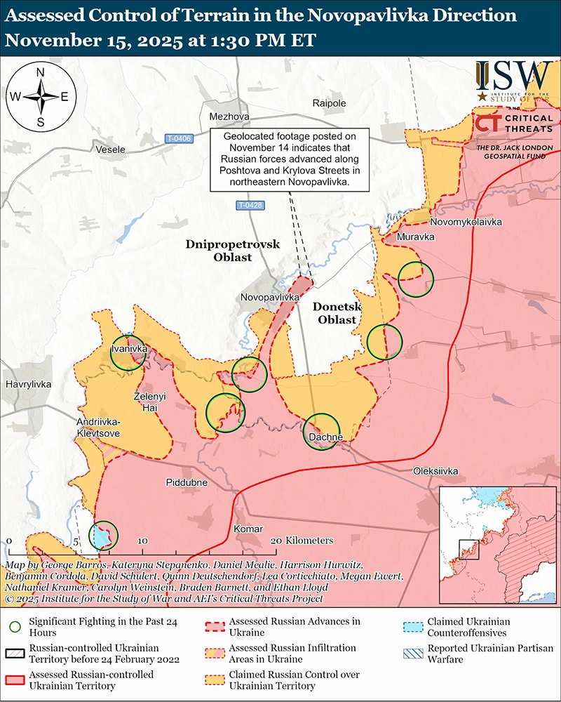 Российские войска атаковали в самой Новопавловке; северо-восточнее Новопавловки в районе Новониколаевки и Муравки; восточнее Новопавловки в районе Котляровки и Гороховое; южнее Новопавловки в районе Ялты, Дачного и Филии; и к юго-западу от Новопавловки в районе Зеленого Гая и Ивановки 14 и 15 ноября. [80]