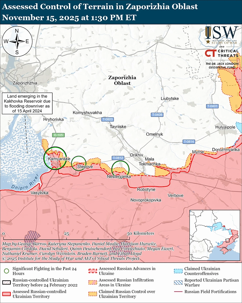 Уточнение территорий под российскими претензиями: на геолоцированных кадрах, опубликованных 14 ноября, видно, как российские войска наносят удары по украинским позициям возле железной дороги «Южная» к юго-западу от Степной Новоселовки (к юго-востоку от Купянска) — района, где, как ранее утверждали российские источники, российские войска сохраняют присутствие. [51]